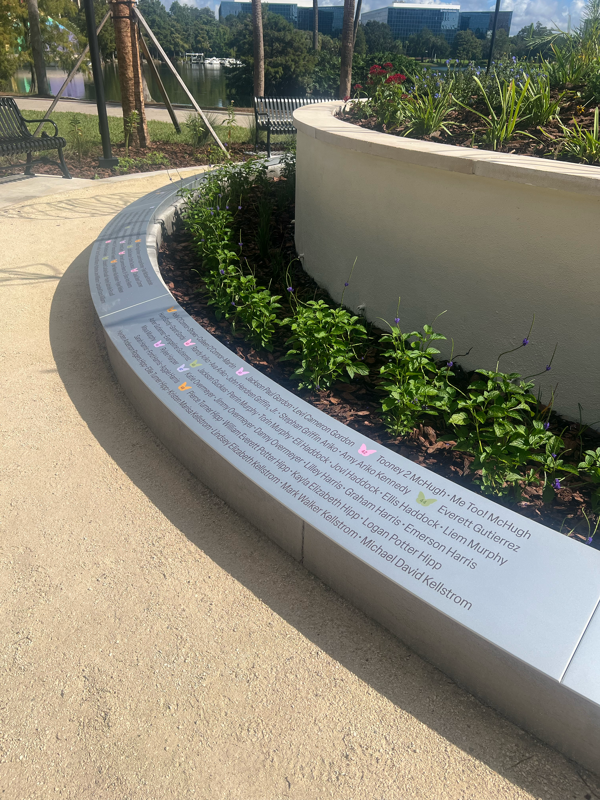 Over the course of various months, I had the opportunity to format and design the donor curb for the Grandmother's Legacy of Love Butterfly Sculpture Garden at Lake Eola Park in Orlando, Florida. The process consisted of using the CAD files created by the Landscape Architects and Engineers to properly fit, format, and scale all 500+ names onto the circular curb. Once the flatlay of the names was approved, a render of the updated donor curb was created. This project provided me with the opportunity to work and meet directly with the fabricators to ensure all paint colors matched the digital files and met all contrast expectations.